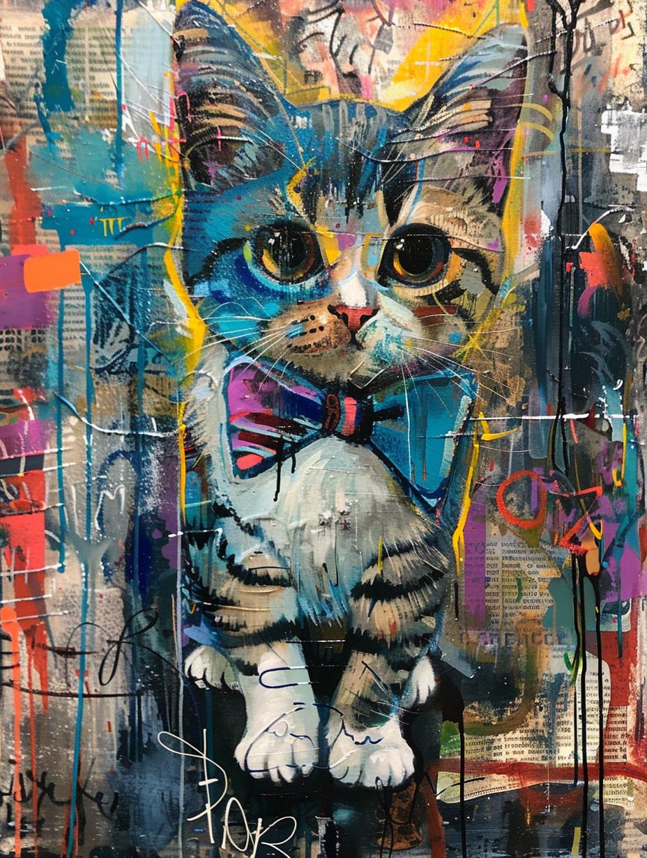 Colorful space American Shorthair cat with a bow Expressive surreal Poster # F024339
