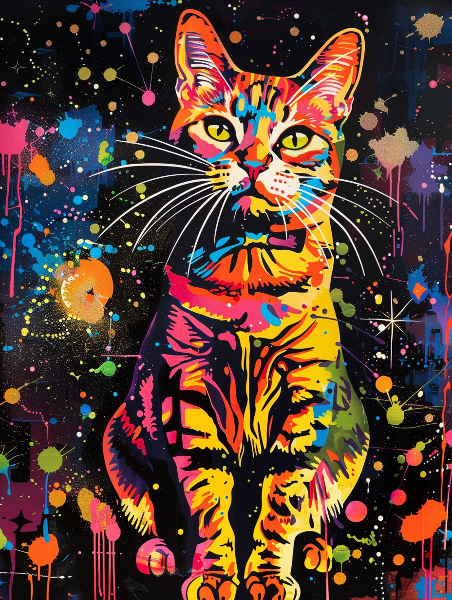 Colorful space American Shorthair cat with a bow Expressive surreal Poster # F024354