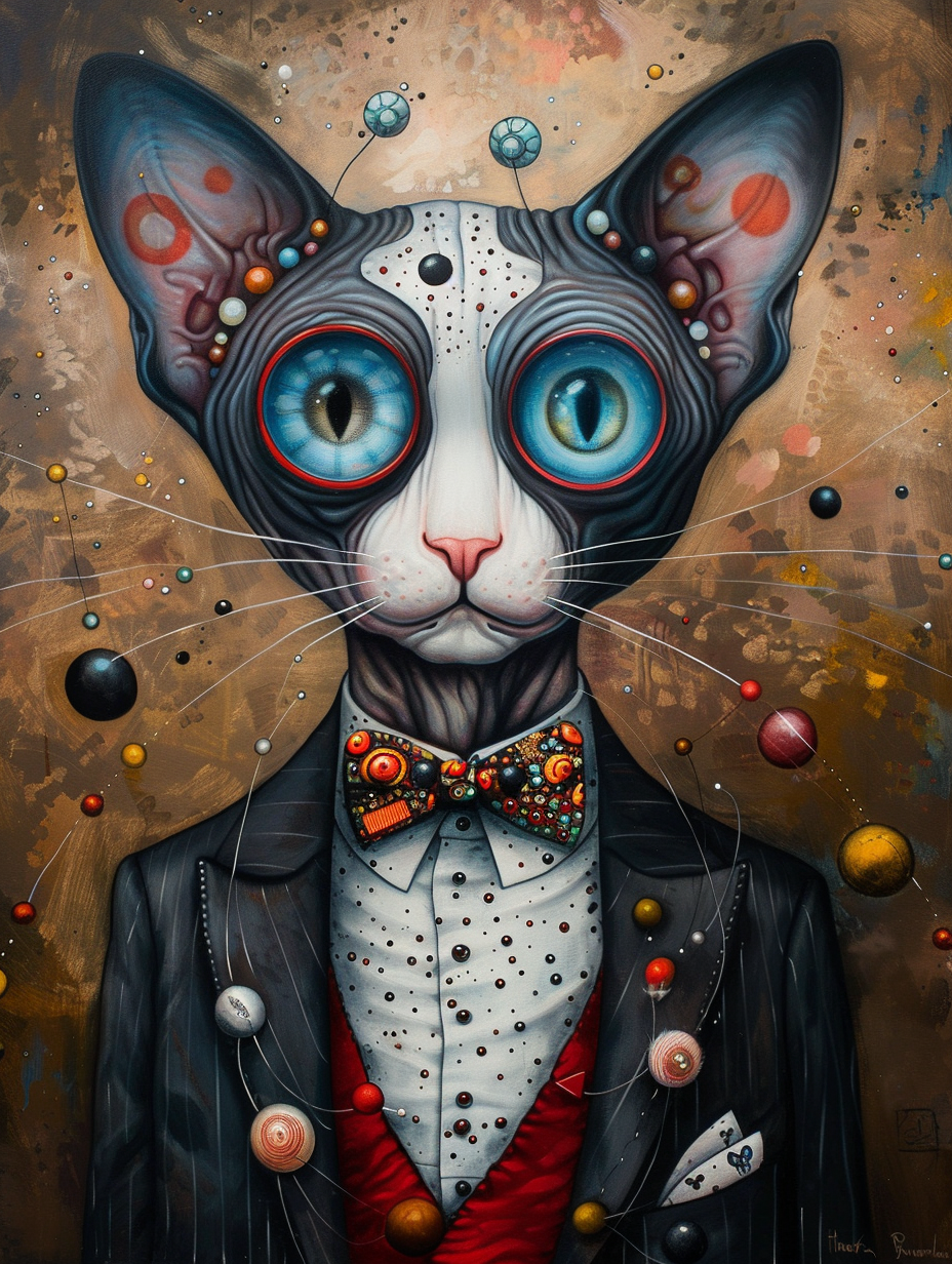 Colorful space Sphynx cat with a bow tie Expressive surreal Poster # F024382