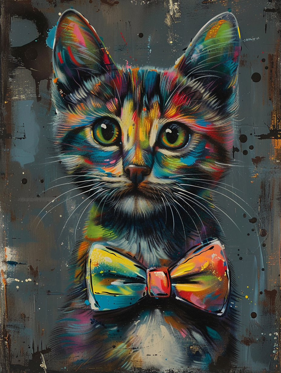 Colorful space Bengal cat with a bow tie Expressive surreal Poster # F024383