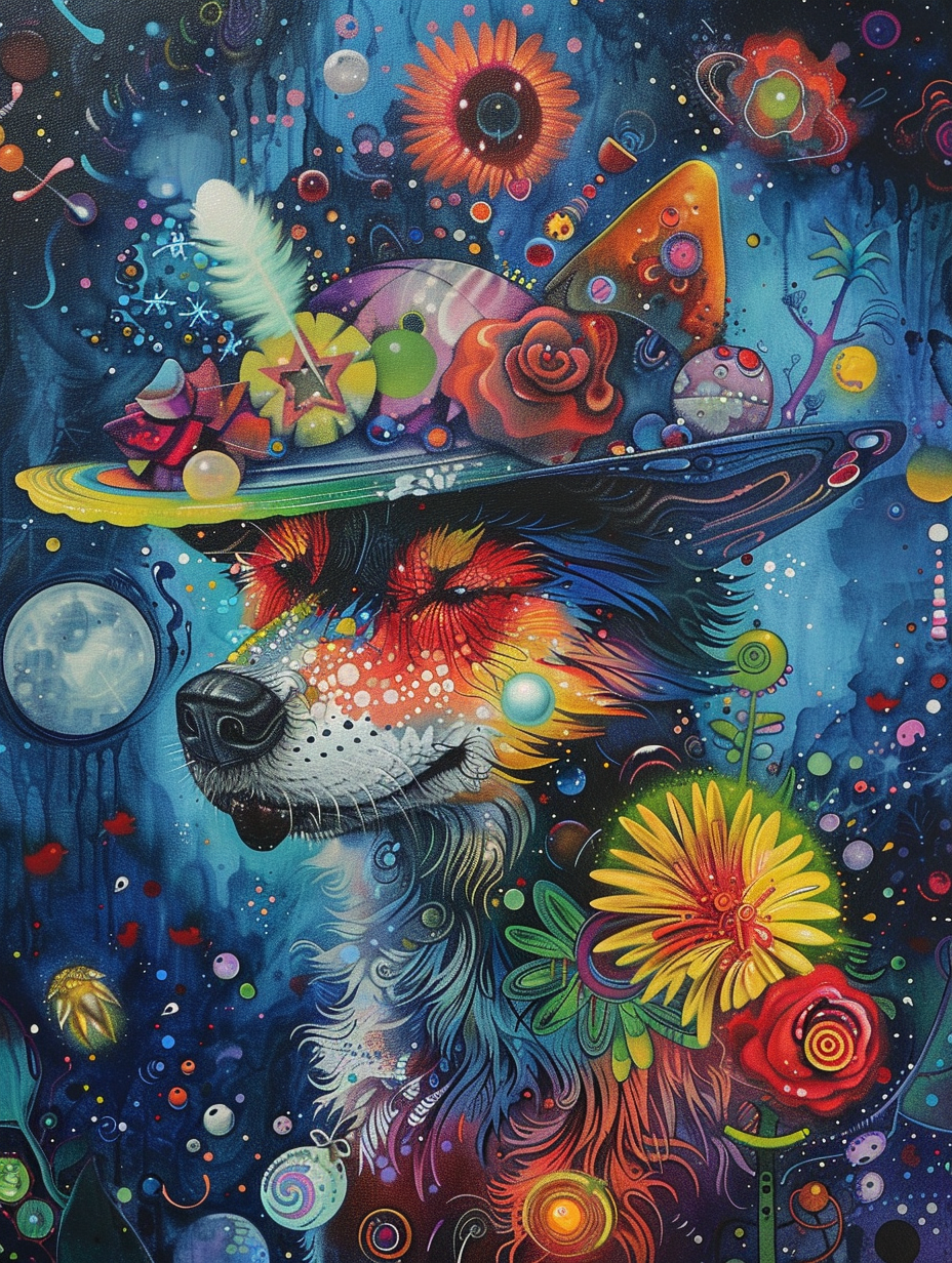 Colorful space Siberian Husky dog with a hat Expressive surreal Poster # F024402