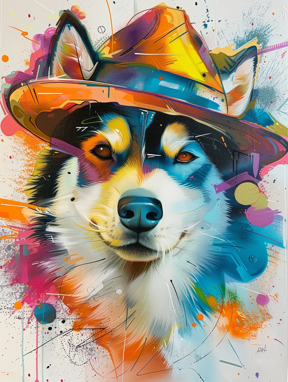 Colorful space Siberian Husky dog with a hat Expressive surreal Poster # F024429