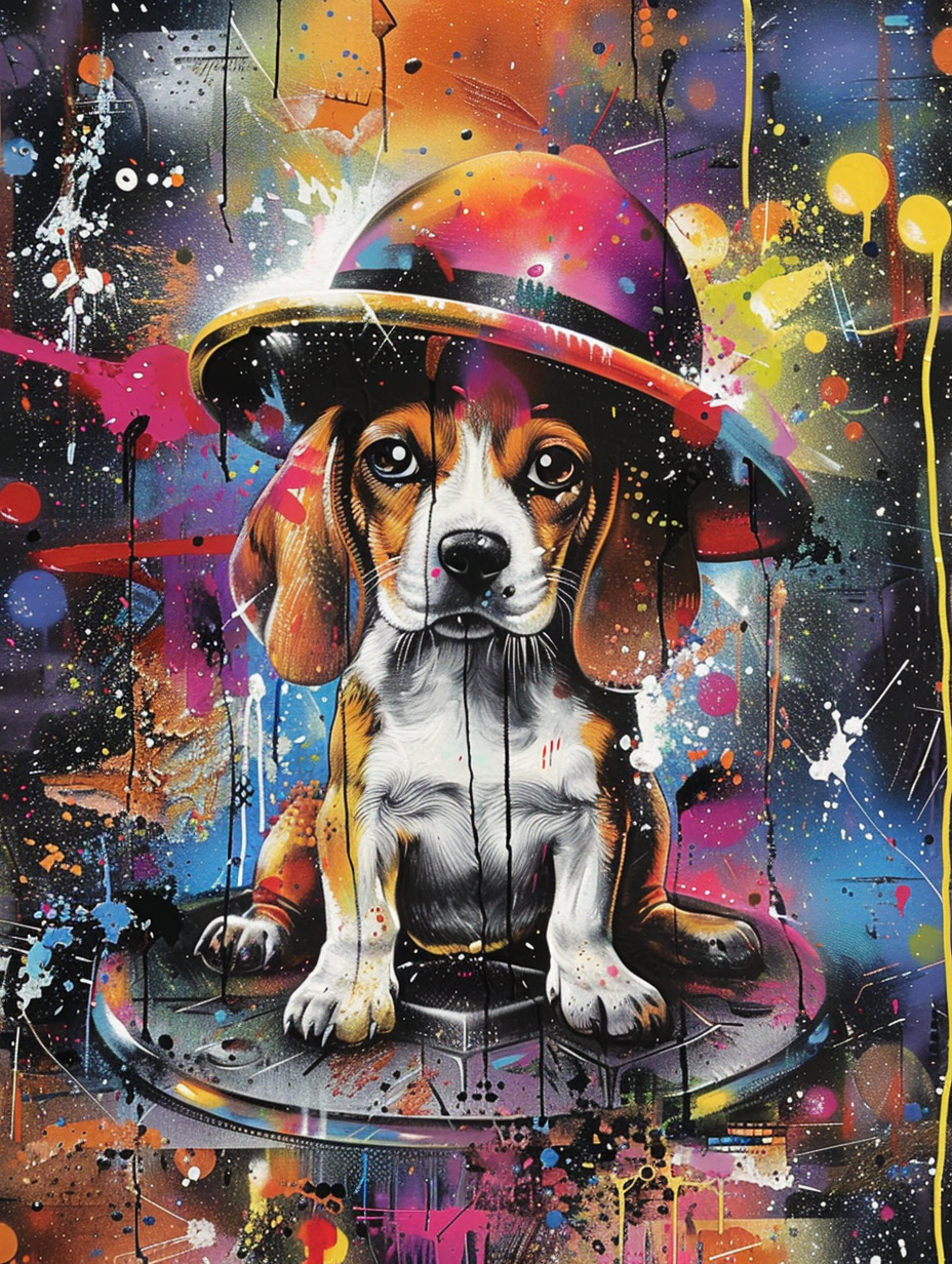 Colorful space Beagle dog with a hat Expressive surreal Poster # F024508
