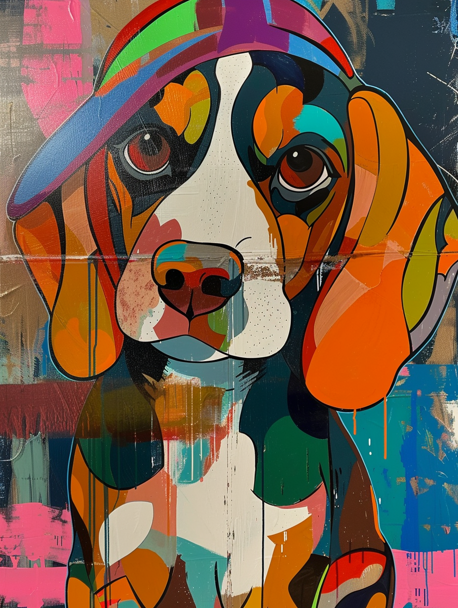 Colorful space Beagle dog with a hat Expressive surreal Poster # F024530