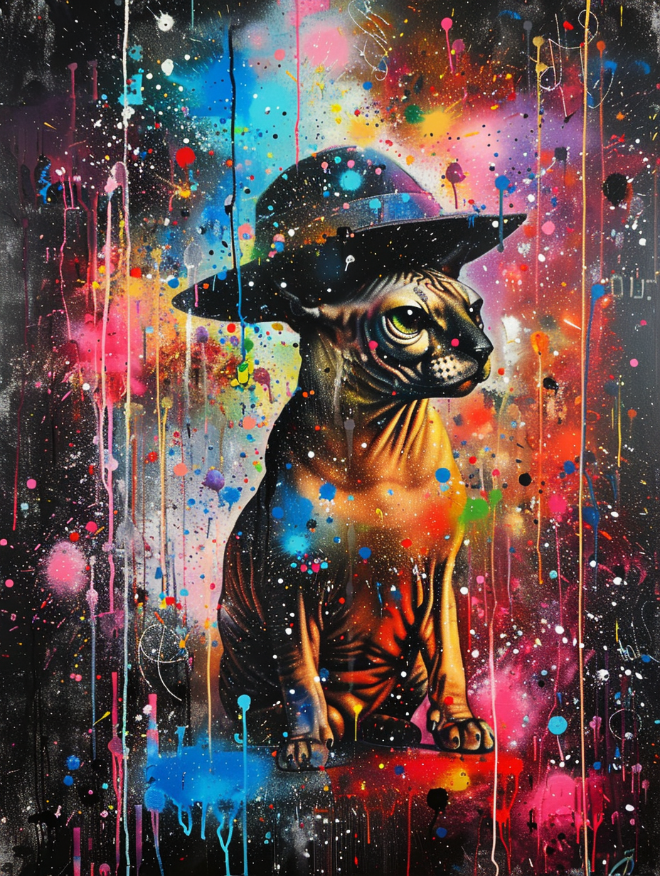 Colorful space Sphynx cat with a hat Expressive surreal Poster # F024645