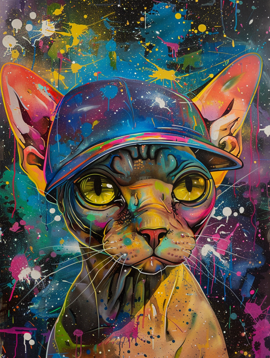 Colorful space Sphynx cat with a hat Expressive surreal Poster # F024649