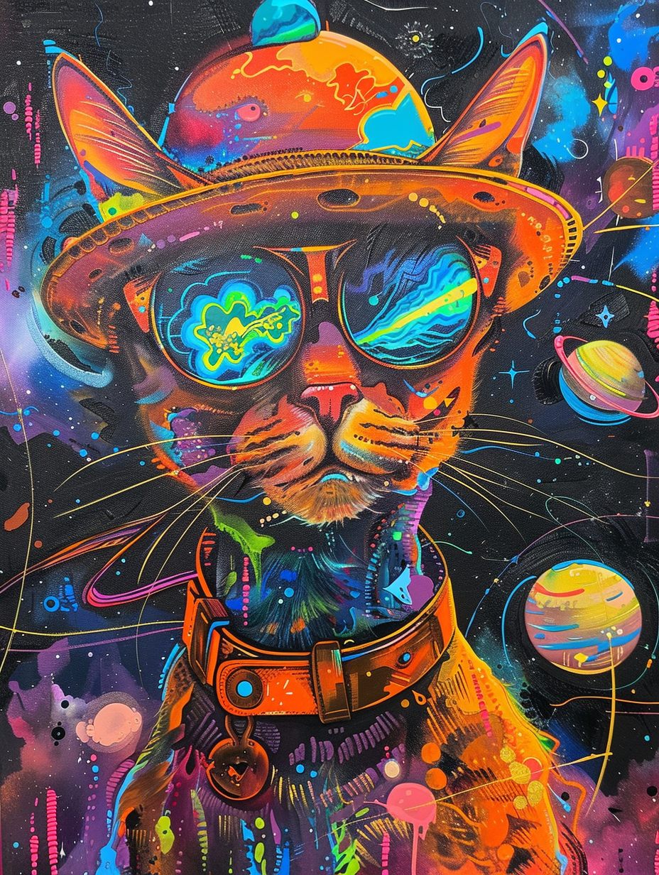 Colorful space Somali cat with a hat Expressive surreal Poster # F024679