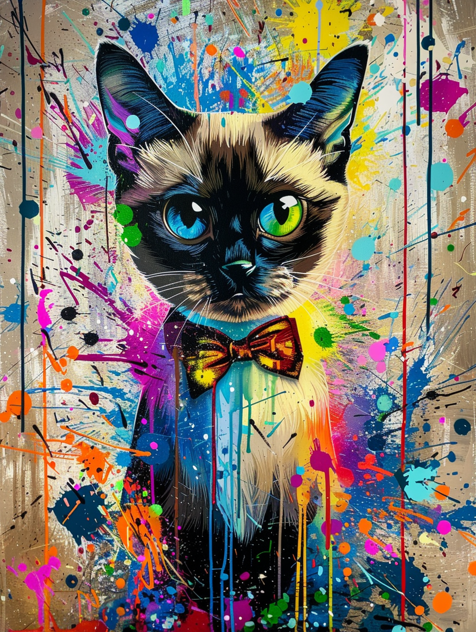 Colorful space Siamese cat with a bow tie Expressive surreal Poster # F024696