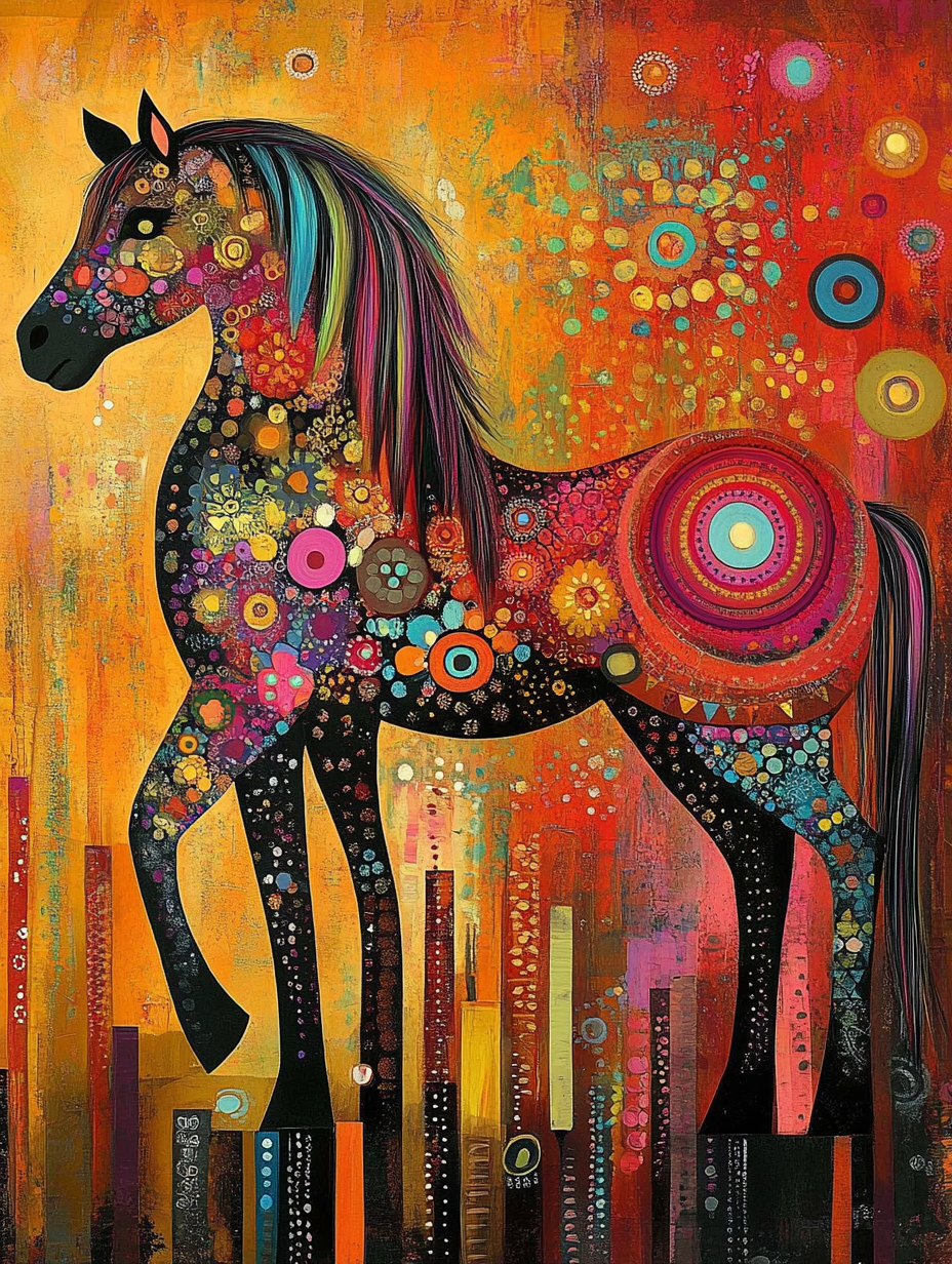 The silhouette of a horse with an abstract colorful background Expressive surreal Poster # F024822