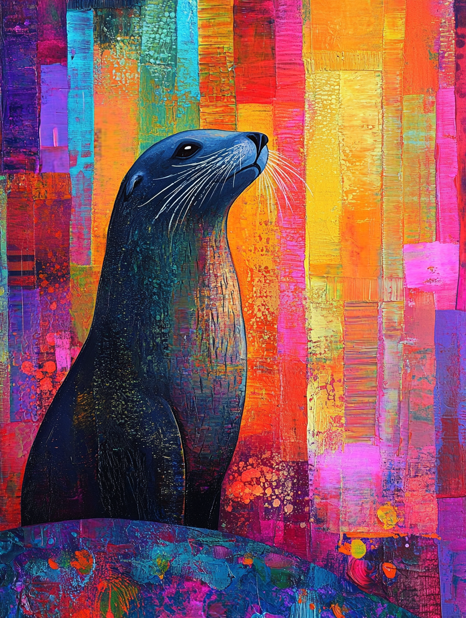The silhouette of a sea lion with an abstract colo Expressive surreal Poster # F024828