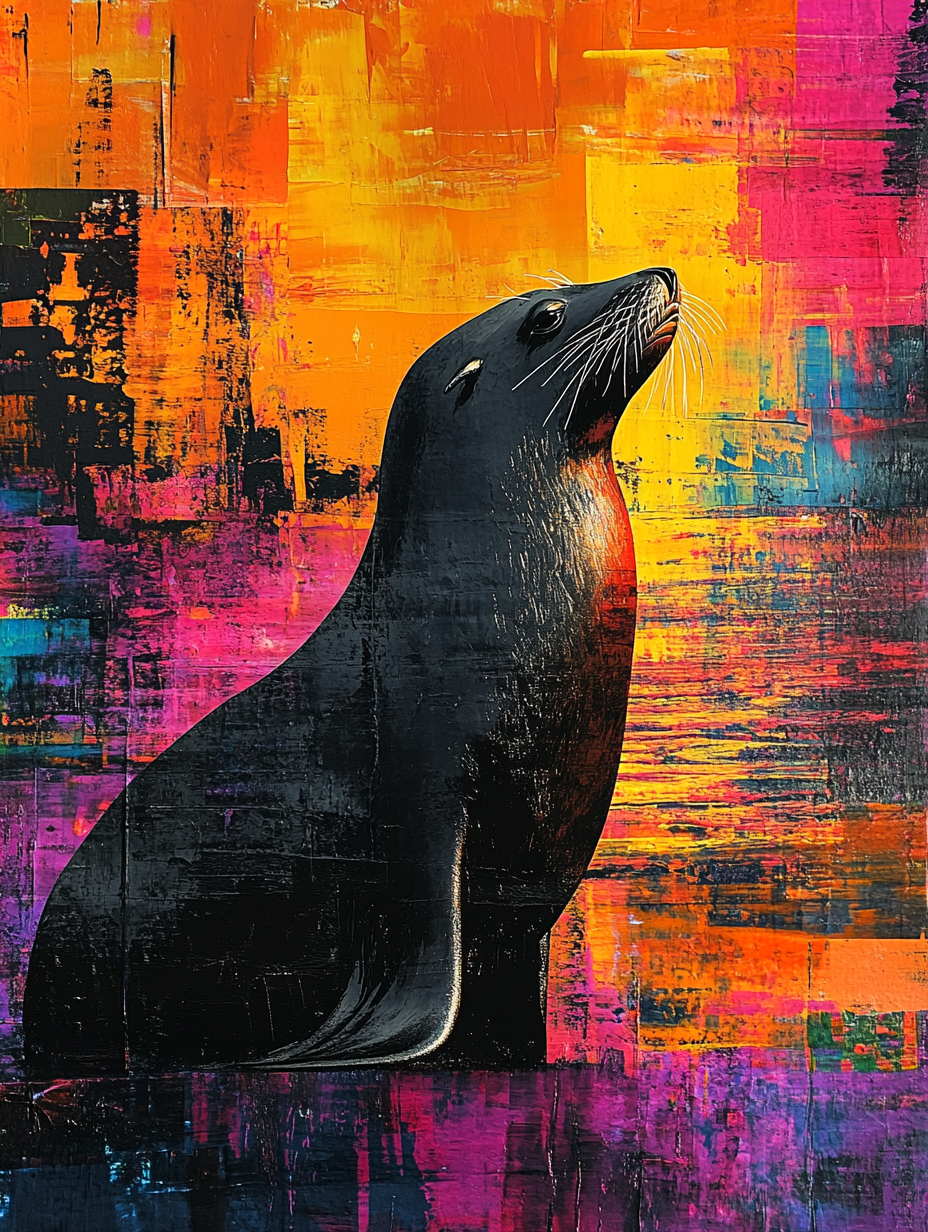 The silhouette of a sea lion with an abstract colo Expressive surreal Poster # F024850