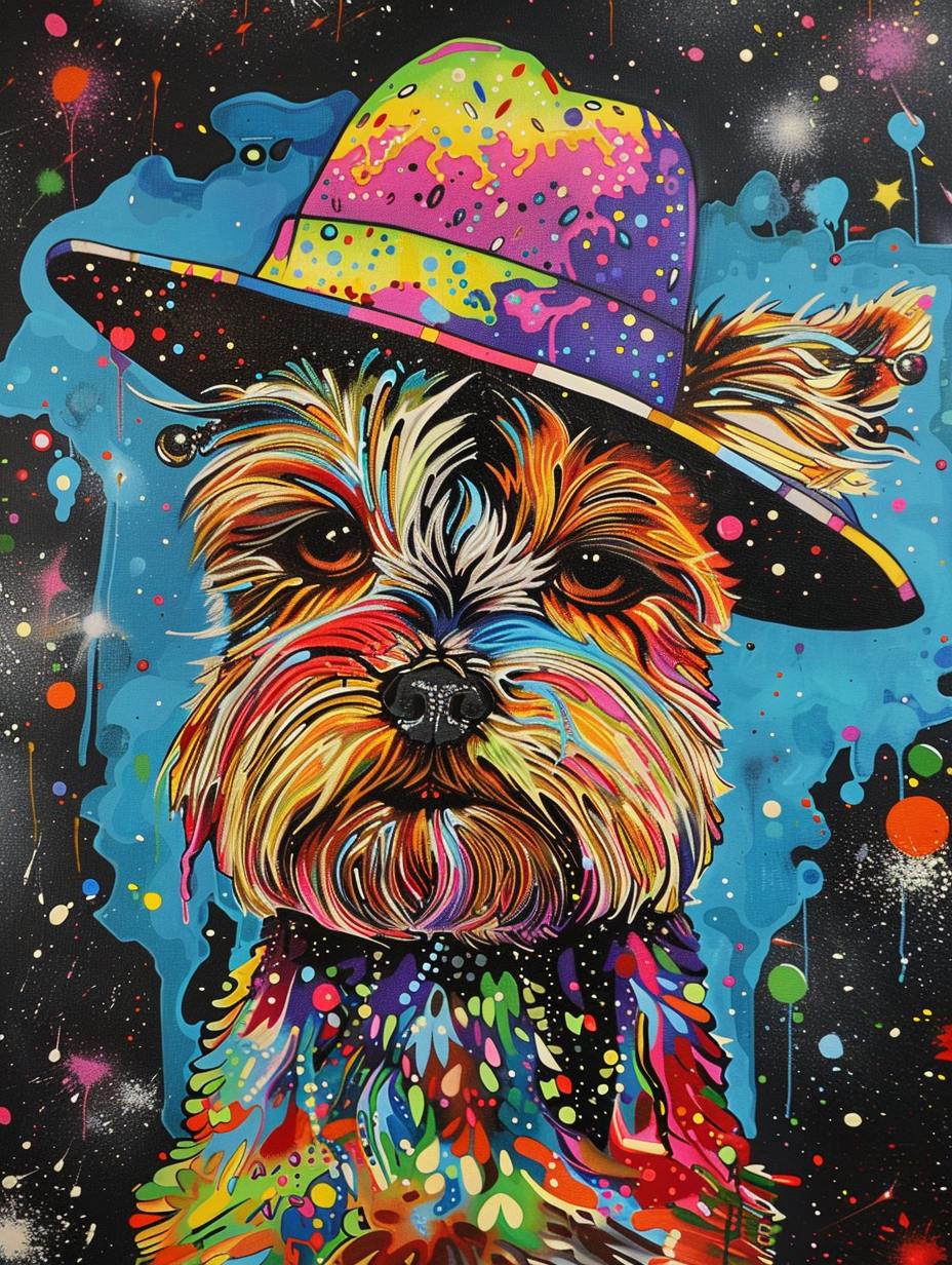 Colorful space Yorkshire Terrier dog with a hat Expressive surreal Poster # F024870