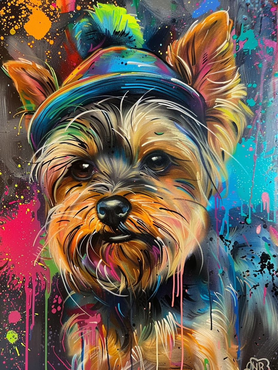 Colorful space Yorkshire Terrier dog with a hat Expressive surreal Poster # F024886