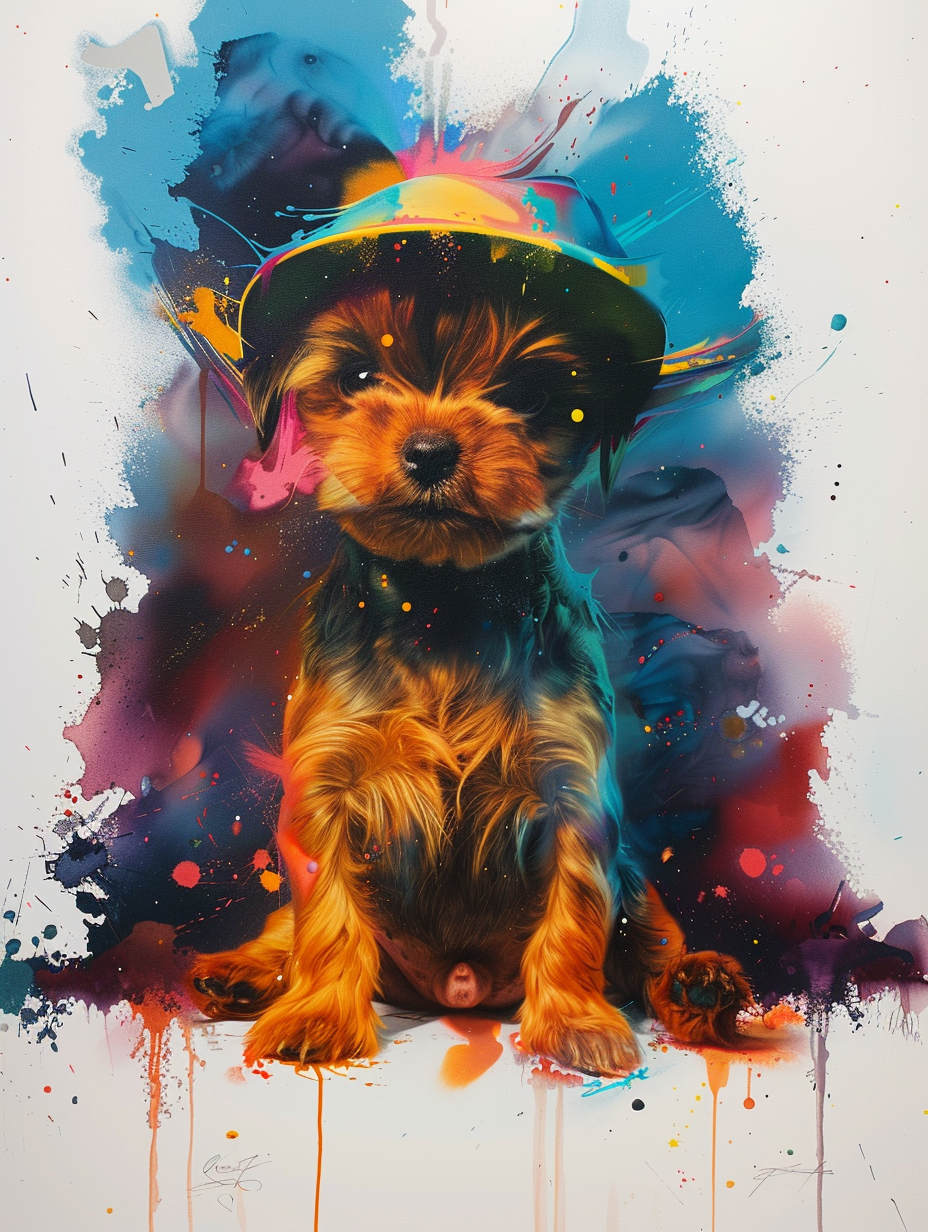 colorful space Yorkshire Terrier dog with a hat Expressive surreal Poster # F024910