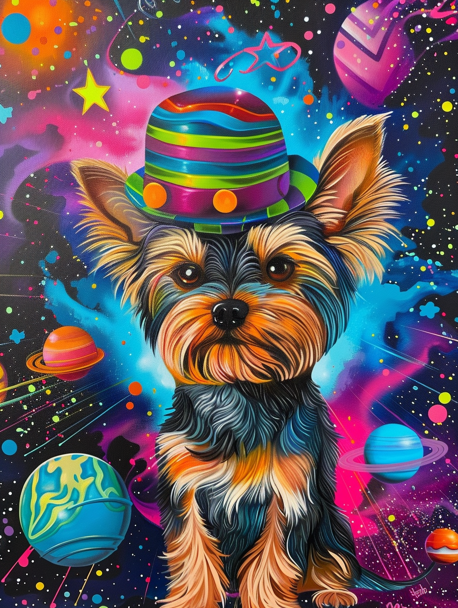 Colorful space Yorkshire Terrier dog with a hat Expressive surreal Poster # F024927