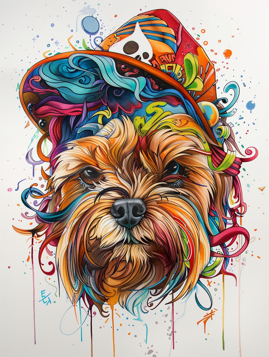 Colorful space Yorkshire Terrier dog with a hat Expressive surreal Poster # F024957