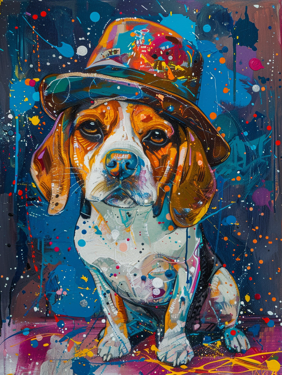 Colorful space Beagle dog with a hat Expressive surreal Poster # F025038