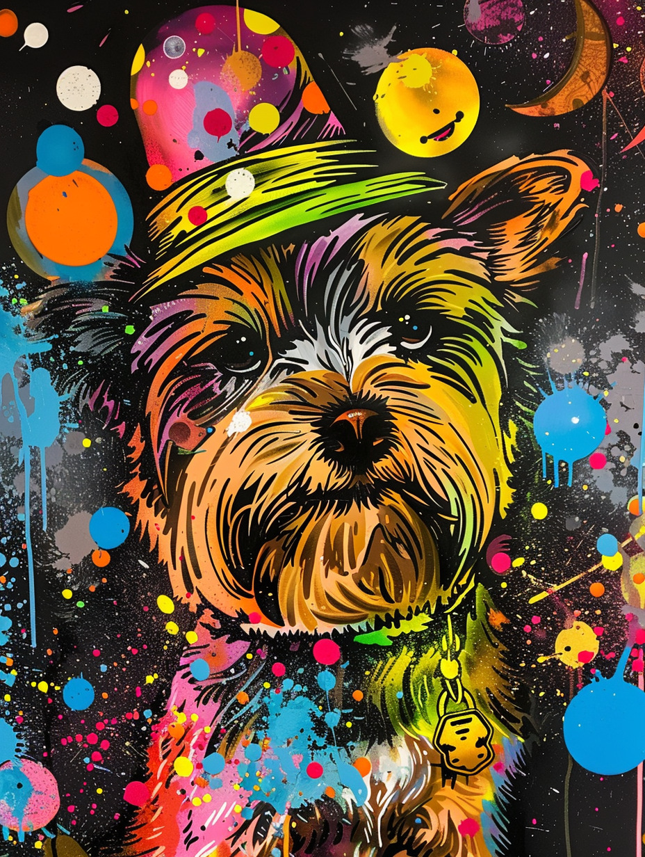 Colorful space Yorkshire Terrier dog with a hat Expressive surreal Poster # F025067