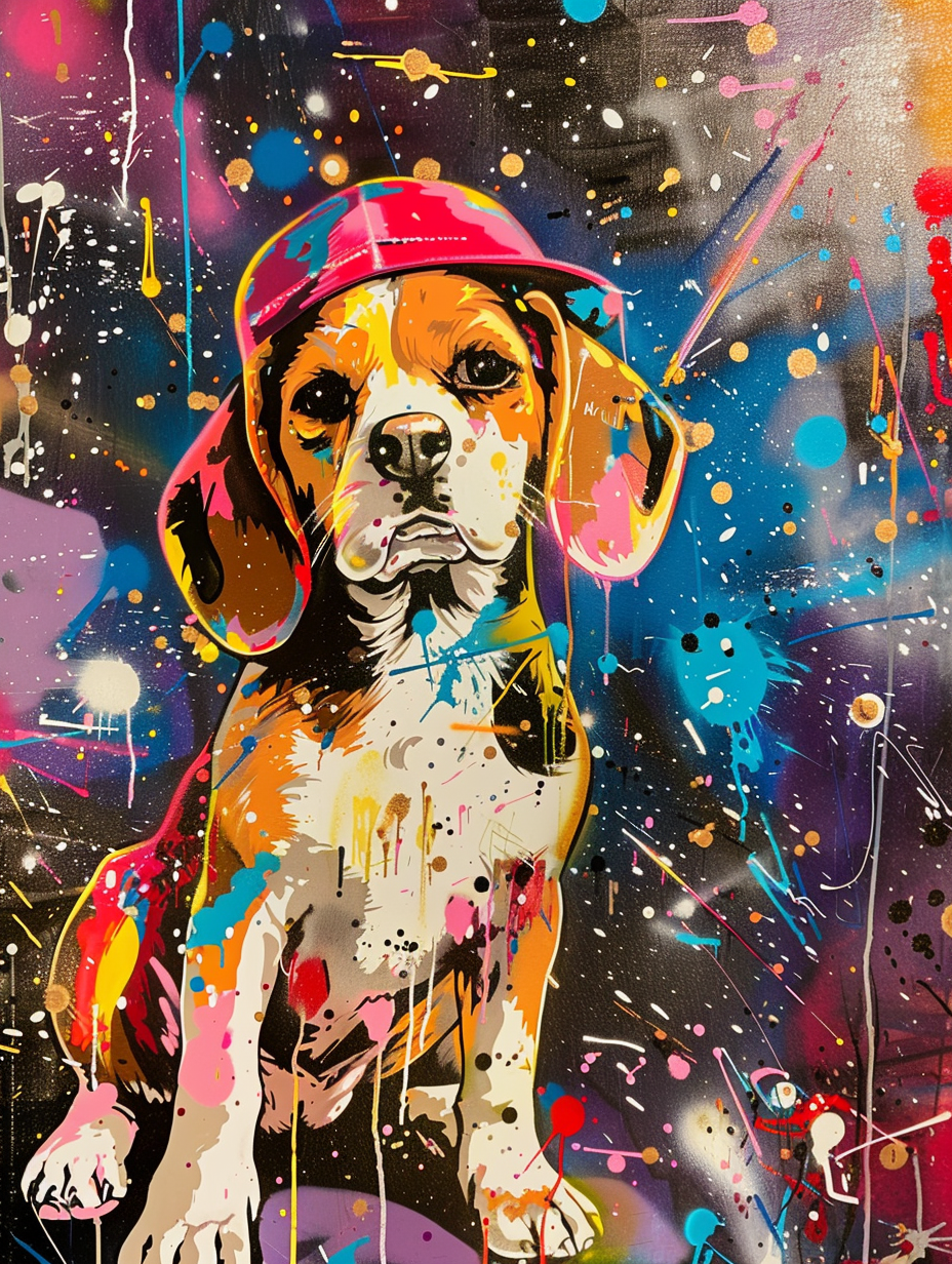 Colorful space Beagle dog with a hat Expressive surreal Poster # F025086