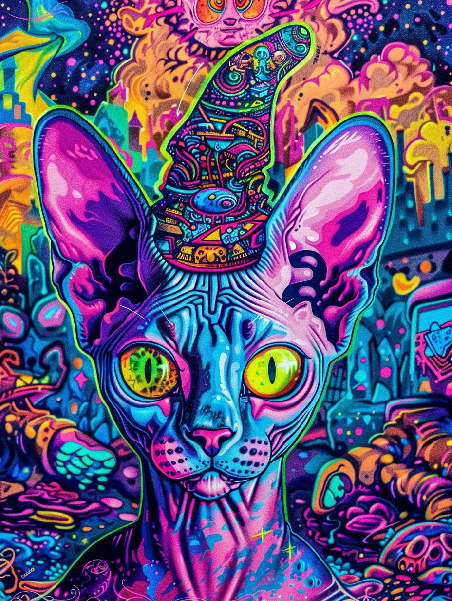 Colorful space Sphynx cat with a hat Expressive surreal Poster # F025300