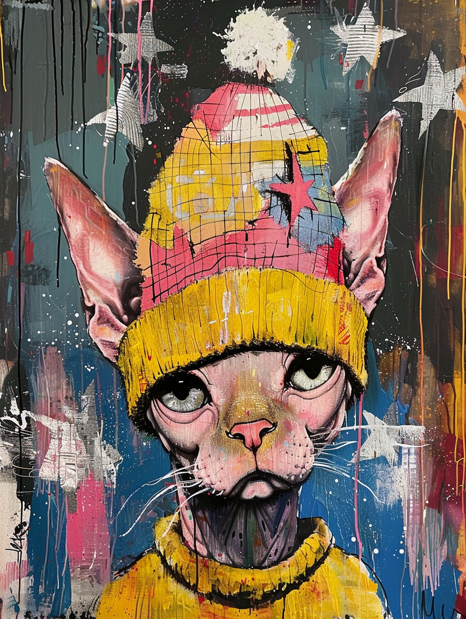 Colorful space Sphynx cat with a hat Expressive surreal Poster # F025307
