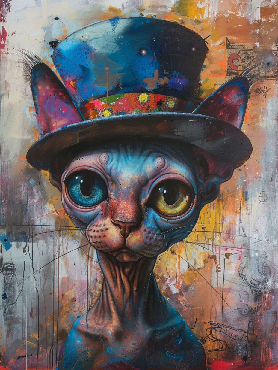 Colorful space Sphynx cat with a hat Expressive surreal Poster # F025333