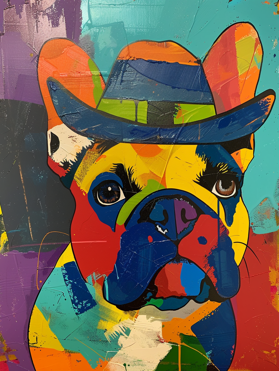 Colorful space French Bulldog dog with a hat Expressive surreal Poster # F025417