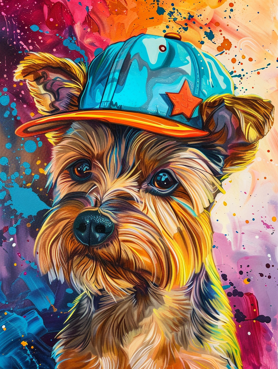 Colorful space Yorkshire Terrier dog with a hat Expressive surreal Poster # F025612