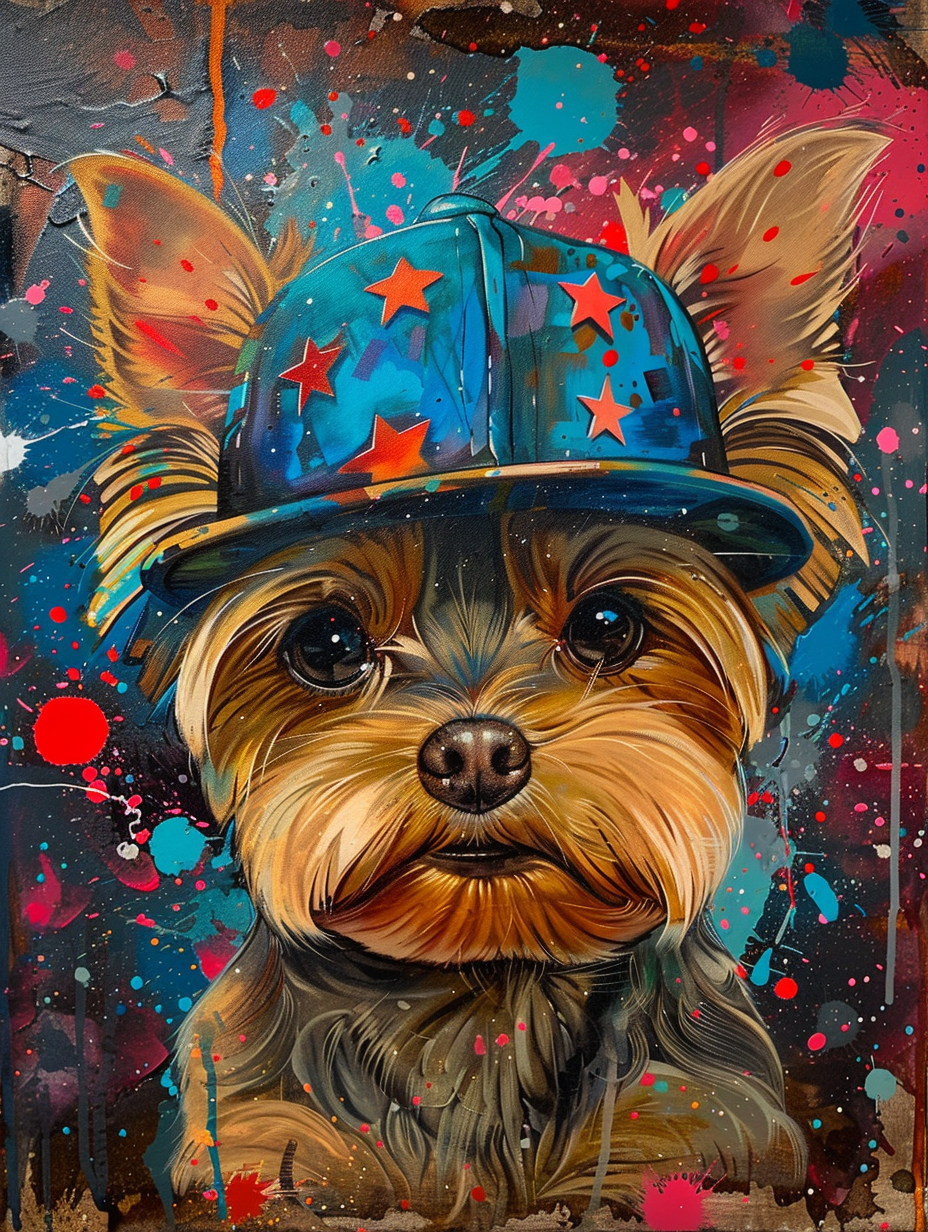 Colorful space Yorkshire Terrier dog with a hat Expressive surreal Poster # F025618